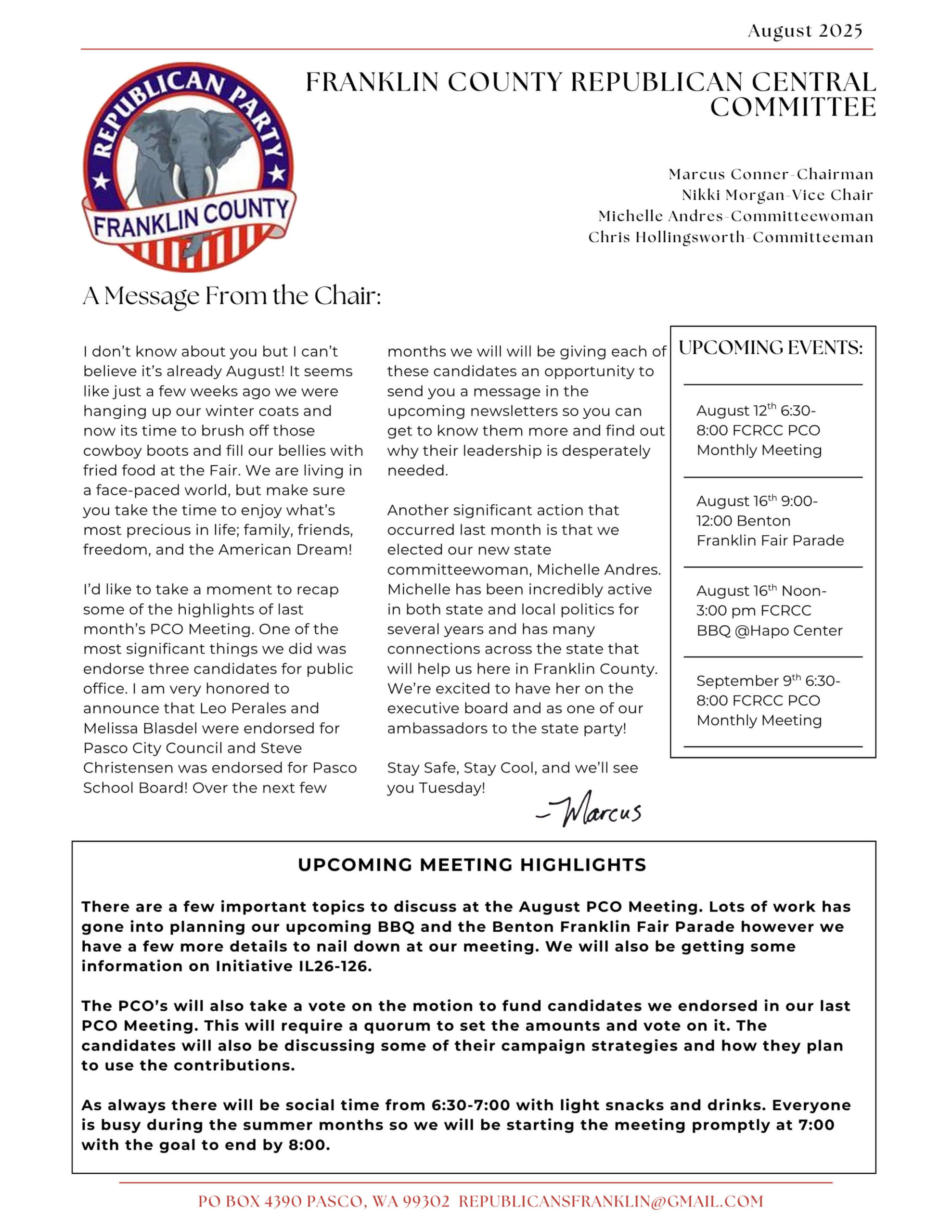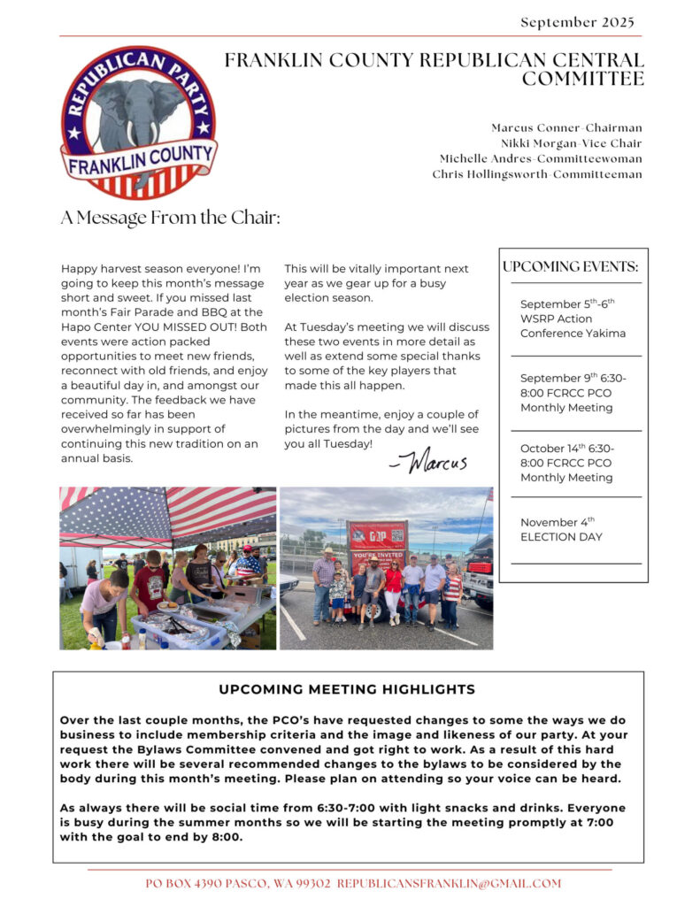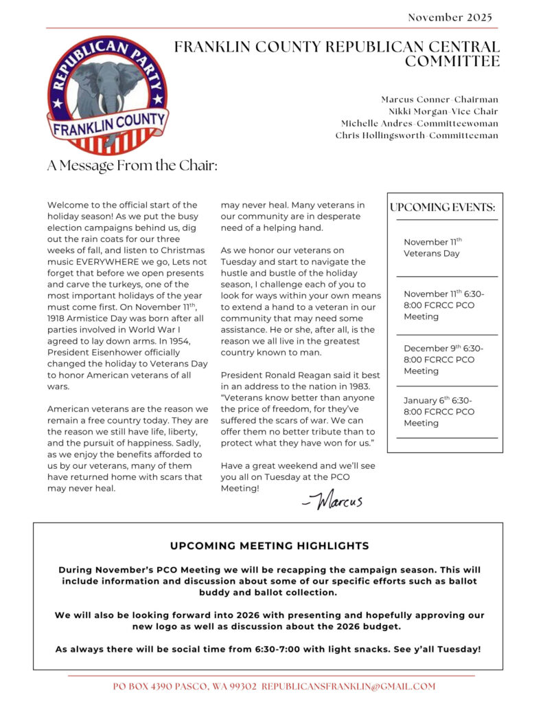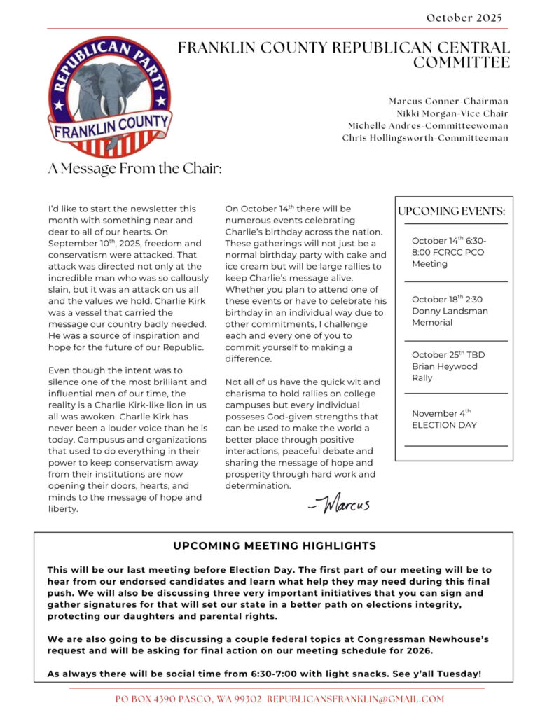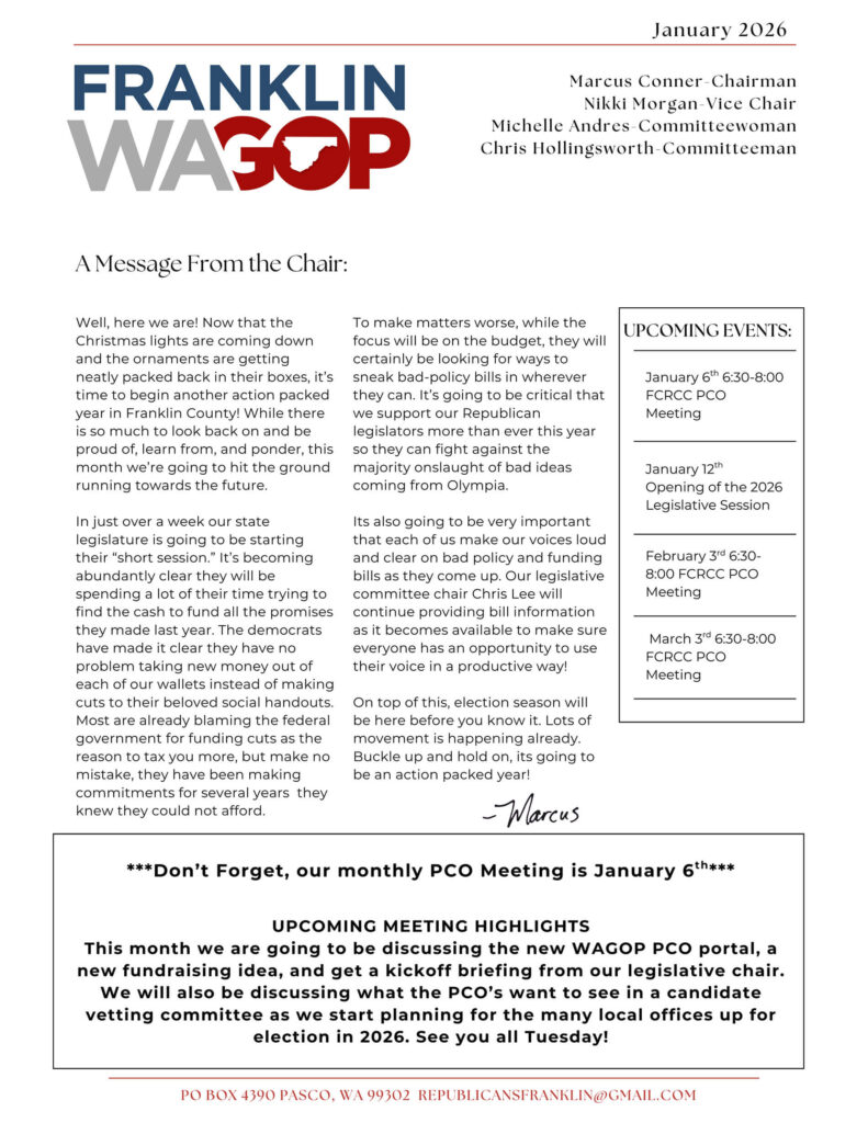 Each month, our Chairman shares highlights, wins, and updates from Franklin WA GOP. These messages celebrate progress, community involvement, and opportunities ahead.